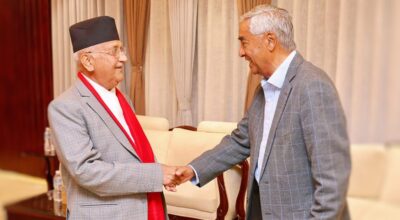 काठमाडौं । नेकपा (एमाले) का अध्यक्ष केपी शर्मा ओली र नेपाली काँग्रेसका सभापति शेरबहादुर देउवाबीच भेटवार्ता भएको छ । ओली
