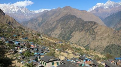 म्याग्दी : पृष्ठभूमिमा गुर्जा र धवलागिरि हिमाल। भिरालो पाखामा गुजमुज्ज ढुङ्गे घरहरू। ग्रामीण जीवनशैली। हिउँदमा बेँसी र बर्खामा लेक जाने पशुका
