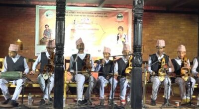 काठमाडौं, मंसिर २० । इँटा र काष्ठकलाले सजिएको फल्चा । सारङ्गी र मादलसहित दौरासुरुवालमा ठाँटिएर फल्चामा लहरै बसेका बालकलाकार ।