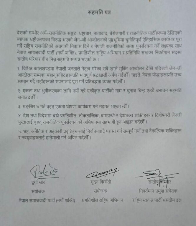 सहमतिपत्रमा नेसपा नयाँ शक्तिको तर्फबाट संयोजक दुर्गा सोव, प्रगतिशील जागरण अभियानको तर्फबाट सुदन किराती र परियारले हस्ताक्षर गरेका छन्।