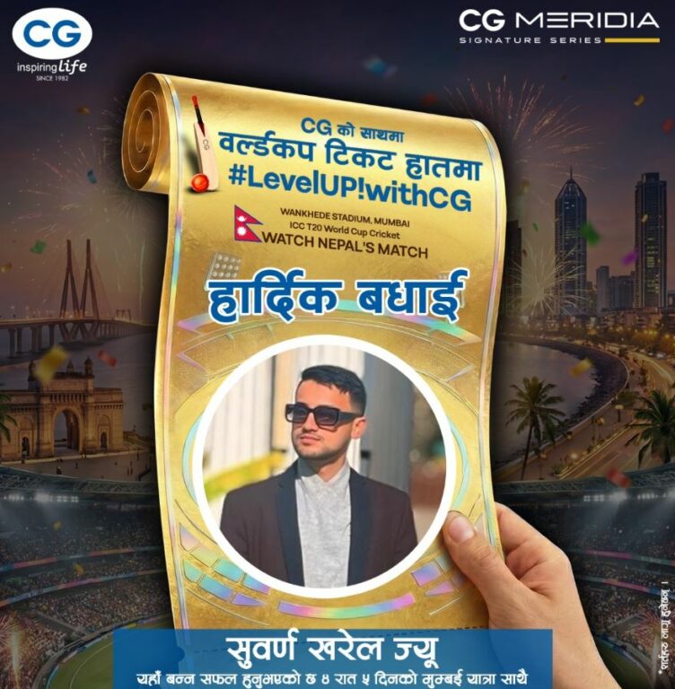 काठमाडौँ । नेपालको सर्वाधिक विश्वासिलो इलेक्ट्रोनिक्स ब्रान्ड सिजी ब्रान्डले आफ्नो सिजीको साथमा, वर्ल्डकप टिकट हातमा #LevelUP!withCG योजना अन्तर्गत तेस्रो चरणका विजेता सार्वजनिक गरेको छ।