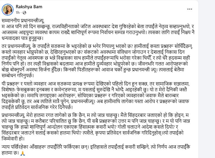 उनले जटिल अवस्थामा देशको नेतृत्व सम्हालेर निर्वाचन सम्पन्न गराएकोमा प्रधानमन्त्रीलाई धन्यवाद दिँदै वर्तमान समयमा सडक र सामाजिक सञ्जालमा युवाहरूले भोग्नुपरिरहेको दुर्व्यवहारप्रति चिन्ता व्यक्त गरेकी छिन् ।