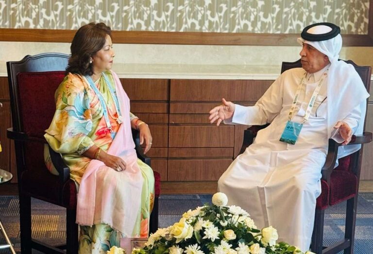 काठमाडौँ : परराष्ट्रमन्त्री डा आरजु राणा देउवासँग कतारका विदेशराज्यमन्त्री सुल्तान बिन साद बिन सुल्तान अल मुराइखीले आज ओमनको राजधानी मस्कटमा शिष्टाचार भेटवार्ता गर्नुभएको छ । आठौँ हिन्द महासागरीय सम्मेलनमा सहभागिताका लागि ओमनको मस्कटमा रहनुभएका उहाँहरुबीच आज साइडलाइन भेट भएको हो । सो भेटका क्रममा उहाँहरुबीच नेपाल कतारबीचको सम्बन्ध, द्विपक्षीय हित र पारस्पारिक लाभका विविध विषयका साथै कतारमा नेपाली विद्यार्थीलाई छात्रवृत्ति तथा दक्ष प्राविधिक जनशक्तिलगायतका विषयमा कुराकानी भएको थियो । त्यसअवसरमा मन्त्री डा देउवाले हमास समूहको नियन्त्रणमा रहेका नेपाली युवा विपिन जोशीको रिहाइका लागि सहयोग गरिदिन मन्त्री मुराइखीसँग आग्रह गर्नुभएको थियो ।