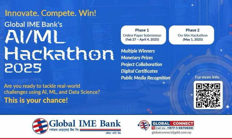 काठमाडौं । ग्लोबल आइएमई बैंक लिमिटेडले पहिलो पटक आर्टिफिसिएल इन्टेलिजेन्स (एआई) र मेसिन लर्निङ (एमएल) सम्बन्धी “ग्लोबल आइएमई एआईरएमएल ह्याकाथन” आयोजना गर्ने भएको छ । बैंकले प्रविधिमा रुची राख्ने विद्यार्थी, स्टार्टअप, डेभलपर, डेटा वैज्ञानिक तथा अनुसन्धानकर्ताहरुलाई लक्षित गर्दै सम्भावित नविनतम् प्रविधिमा आधारित बैंकिङ सेवाहरु विकासका लागि यो प्रतियोगिता संचालन गर्न लागेको हो । यसका साथै यस ह्याकाथनले डिजिटल बैंकिङमा आउने सम्भावित सेवाहरु र यसको चुनौतिहरुको समाधान खोज्न समेत सहयोग पुग्नेछ ।