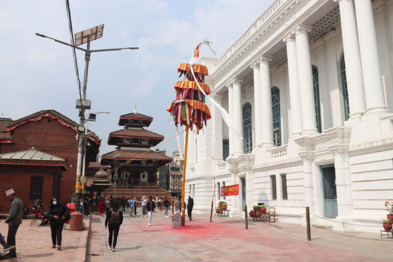काठमाडौं । काठमाडौंको बसन्तपुरमा होलीको चीर ठड्याइएको छ। शुक्रबार बिहान रंगीविरंगी कपडाहरुको ध्वजापताकासहितको तीन खण्डे चीर ठड्याइएको हो। हनुमानढोका दरबारको दक्षिण पटांगिनी, ऐतिकासिक मोहनकाजी चोक तथा दाखचोकमा ३२ फुट उचाइको तीन खण्डे गजुर जस्तो देखिने रंगीविरंगी होली चीर ठड्याइएको हो।