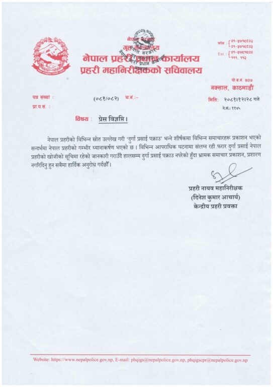 प्रहरीको विभिन्न स्रोत उल्लेख गरी ‘दुर्गा प्रसाईँ पक्राउ’ भन्ने शीर्षकमा विभिन्न सञ्चारमाध्यममा समाचार प्रकाशन भएकामा आफूहरूको गम्भीर ध्यानाकर्षण भएको प्रहरी प्रवक्ता प्रहरी नायब महानिरीक्षक दिनेशकुमार आचार्यले जानकारी दिनुभयो ।