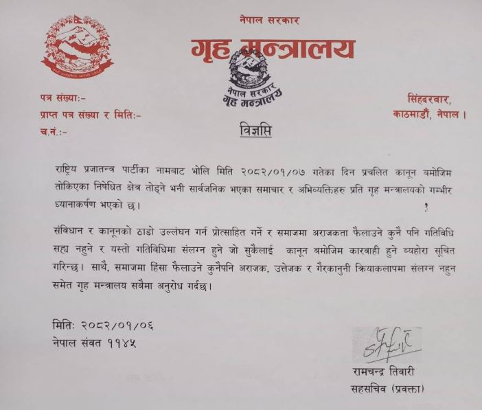 ‘संविधान र कानुनको ठाडो उल्लङ्घन गर्न प्रोत्साहित गर्ने र समाजमा अराजकता फैलाउने कुनै पनि गतिविधि सह्य नहुने र यस्तो गतिविधिमा संलग्न हुने जो सुकैलाई कानुन बमोजिम कारबाही हुने ब्यहोरा सूचित गरिन्छ’ विज्ञप्तिमा भनिएको छ ‘समाजमा हिंसा फैलाउने कुनै पनि अराजक , उत्तेजक र गैर कानुनी क्रियाकलापमा संलग्न नहुन समेत गृह मन्त्रालय सबैमा अनुरोध गर्दछ । ’ लोकतान्त्रिक व्यवस्था नै फालेर राजसंस्था र हिन्दु राष्ट्र पुनः स्थापना गर्न आन्दोलन गर्दै आएको राष्ट्रिय प्रजातन्त्र पार्टीले सरकारलाई निषेधित क्षेत्र तोड्ने ठाडो चुनौती दिएको छ। बिहीबारको केन्द्रीय कार्यसम्पादन समिति बैठकबाट निर्णय नै गरेर राप्रपाले वैशाख ७ गते निषेधित क्षेत्र तोड्ने भनेको छ। राप्रपाको उक्त चुनौतीपछि गृह मन्त्रालयले कारबाही गर्ने चेतावनीसहितको विज्ञप्ति जारी गरेको हो ।