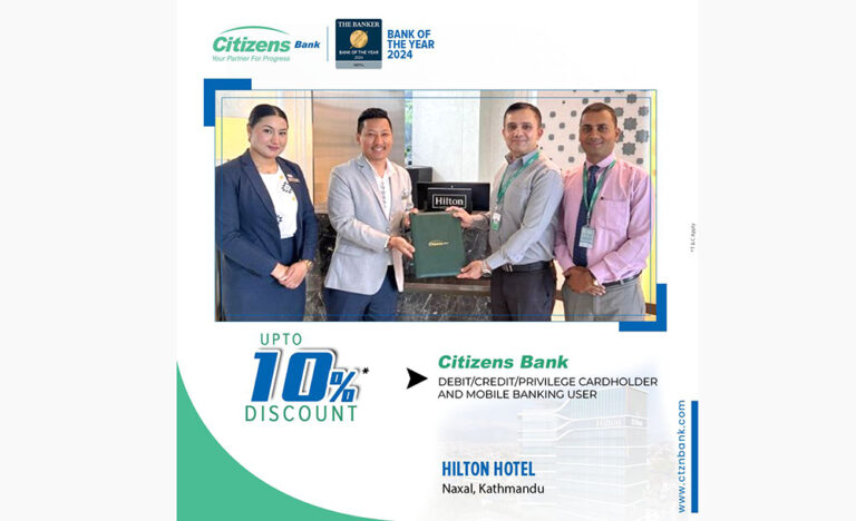 काठमाडौं । सिटिजन्स बैंक इन्टरनेसनल लिमिटेड र नक्साल, काठमाडौँ स्थित हिल्टन काठमाडौँबीच सिटिजन्स बैंकका ग्राहकहरूलाई विशेष छुट दिने समझदारी पत्रमा हस्ताक्षर भएको छ ।