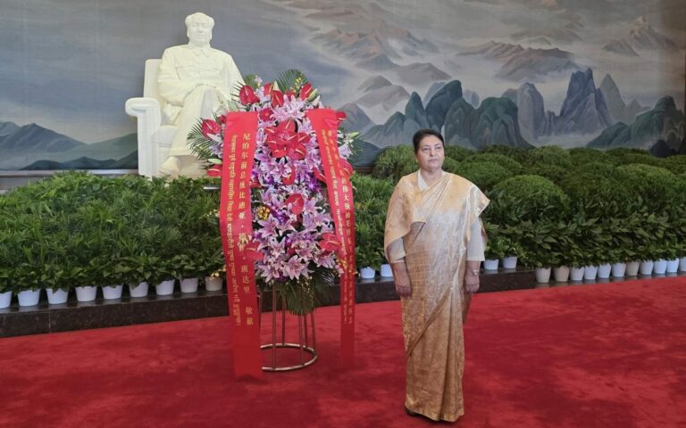 काठमाडौं – चीन भ्रमणमा रहनु भएका पूर्वराष्ट्रपति विद्यादेवी भण्डारीले आज चीनको राजधानी बेइजिङस्थित तियानमेन स्क्वायरमा रहेको चिनियाँ कम्युनिष्ट पार्टीका नेता स्वर्गीय माओत्सेतुङको समाधिस्थलमा पुष्पाहार अर्पण गरी श्रद्धाञ्जली व्यक्त गर्नुभएको छ ।