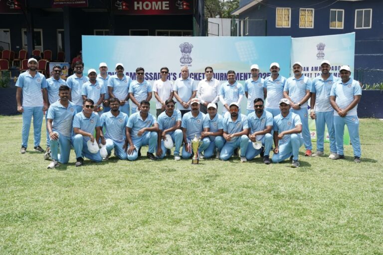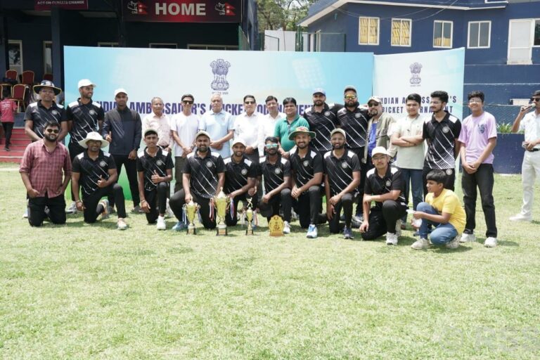 काठमाडौँ, २५ जेठ : काठमाडौँस्थित भारतीय राजदूतावासले यही जेठ १७ गतेदेखि त्रिभुवन विश्वविद्यालय क्रिकेट मैदानमा सुरु गरेको भारतीय राजदूत क्रिकेट प्रतियोगिताको पहिलो संस्करण आज सम्पन्न भएको छ । प्रतियोगितामा भारतीय दूतावास, नेपालको परराष्ट्र मन्त्रालय, बेलायती दूतावास, नेपाल पत्रकार महासङ्घ, ‘कर्पोरेट हाउस’हरु र नेपालमा रहेका भारतीय डायस्पोराको प्रतिनिधित्व गर्ने टोलीहरुको उत्साहजनक सहभागिता रहेको थियो ।