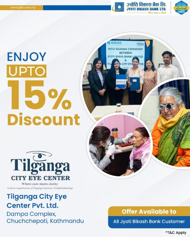 काठमाडाैं । ज्योति विकास बैंक लिमिटेडले काठमाडौं चुच्चेपाटीस्थित “तिलगंगा सिटी आँखा केन्द्र” मा ग्राहकहरूलाई विशेष छुट प्रदान गर्ने सम्बन्धी सम्झौता गरेको छ। यस सम्झौतापश्चात्, ज्योति विकास बैंकका ग्राहकहरूले उक्त आँखा केन्द्रमा १५% सम्म छुट प्राप्त गर्न सक्नेछन्।