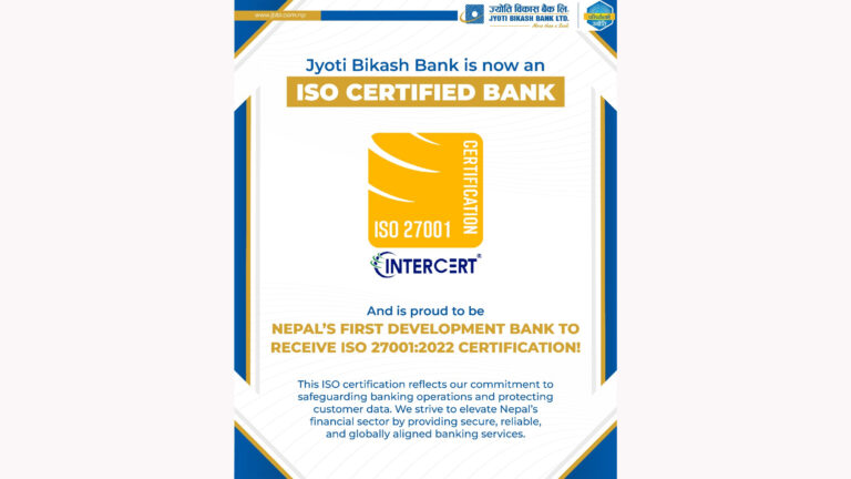 काठमाडौं । ज्योति विकास बैंकले सूचना सुरक्षा व्यवस्थापन प्रणालीमा अन्तर्राष्ट्रिय मान्यता प्राप्त ISO 27001:2022 प्रमाणपत्र प्राप्त गरेको छ। यस सँगै ISO 27001:2022 प्रमाणपत्र प्राप्त गर्ने नेपालको पहिलो विकास बैंकको रूपमा ज्योति विकास बैंकले ऐतिहासिक उपलब्धि हासिल गरेको हो।