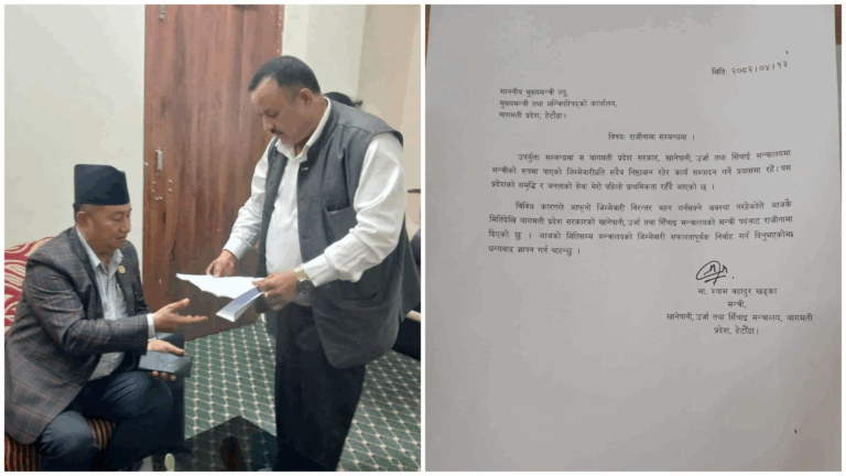 काठमाडौं– बागमती प्रदेशका खानेपानी तथा ऊर्जा सिँचाइमन्त्री श्यामबहादुर खड्काले राजीनामा दिएका छन् । उनले मंगलबार मुख्यमन्त्री बहादुरसिंह लामालाई राजीनामा पत्र बुझाएका छन् ।