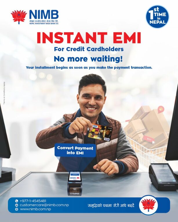 काठमाडौं । नेपाल इन्भेष्टमेण्ट मेगा बैंकले नेपालमै पहिलो पटक ‘पीओएस मेसिन’ मार्फत भुक्तानी गर्दा ‘इन्स्टा ईएमआई’सुविधा ल्याएको छ । जसअनुसार अबदेखि एनआईएमबी क्रेडिट कार्ड प्रयोगकर्ताहरूले कुनैपनि व्यापारिक स्थानमा ‘एनआईएमबी पीओएस मेसिन’ मार्फत भुक्तानी गर्दा सोही क्षणदेखि किस्ताबन्दी सुविधा प्रयोग गर्न सक्नेछन्।