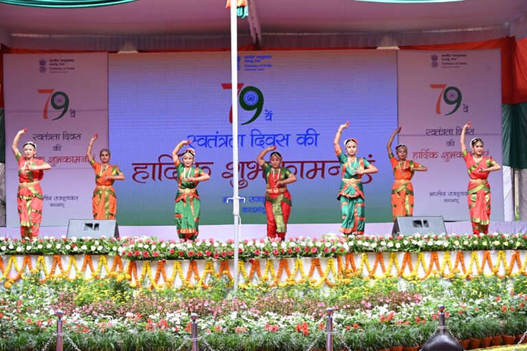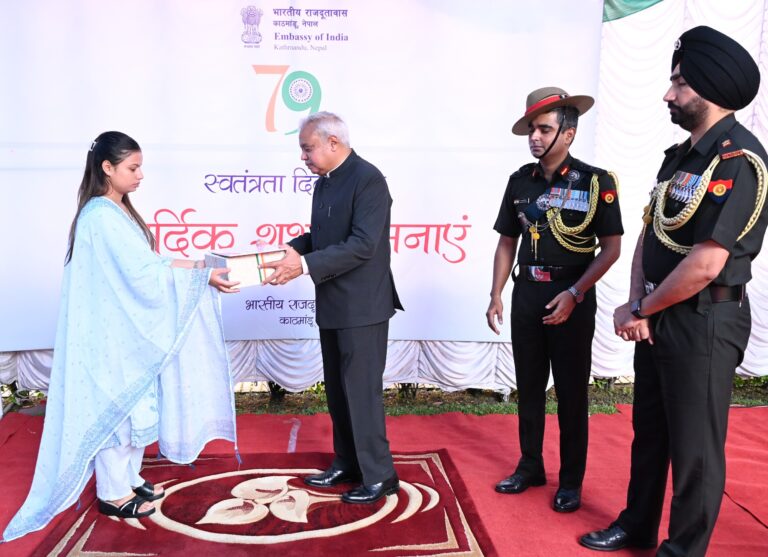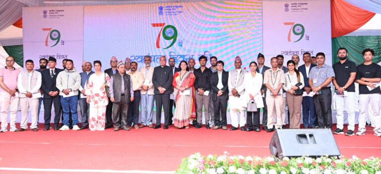 काठमाडौं- काठमाडौंस्थित भारतीय दूतावासले भारतको ७९औँ स्वतन्त्रता दिवस मनाएको छ। नेपालमा रहेका भारतीय समुदाय, दूतावासका अधिकारी लगायतको सहभागीतामा शुक्रबार स्वतन्त्रता दिवस मनाइएको दूतावासले जनाएको छ।