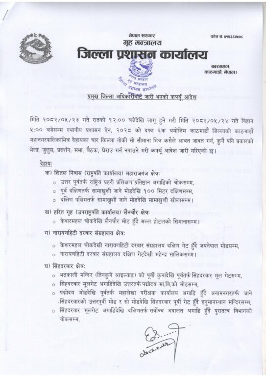 काठमाडौँका प्रमुख जिल्ला अधिकारी छविलाल रिजालले जारी गरेको कर्फ्यु आदेशमा शीतल निवास (राष्ट्रपति कार्यालय) महाराजगञ्ज क्षेत्र, हरितगृह (उपराष्ट्रपति कार्यालय) लैनचौर क्षेत्र, नारायणहिटी दरबार सङ्ग्रहालय क्षेत्र, सिंहदरबार क्षेत्र, प्रधानमन्त्री निवास बालुवाटार क्षेत्र र संसद् भवन नयाँ बानेश्वर क्षेत्रमा बिहान ५ बजेसम्म कर्फ्यु जारी रहनेछ ।