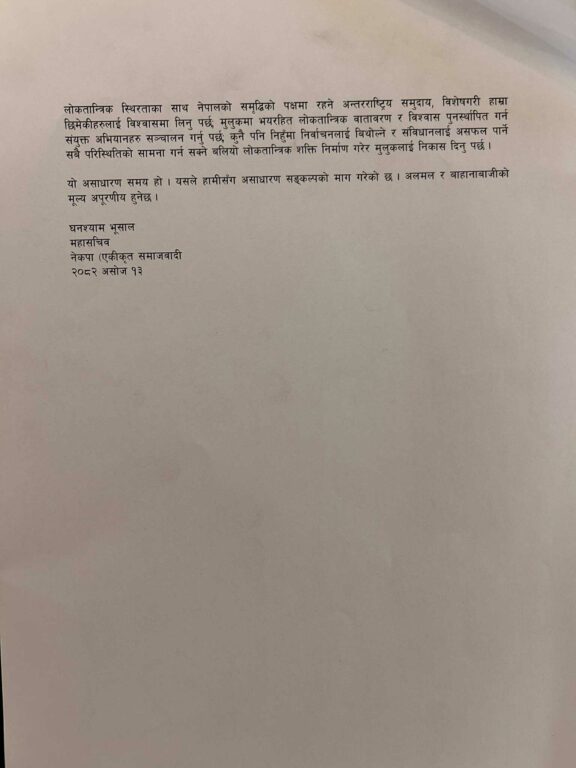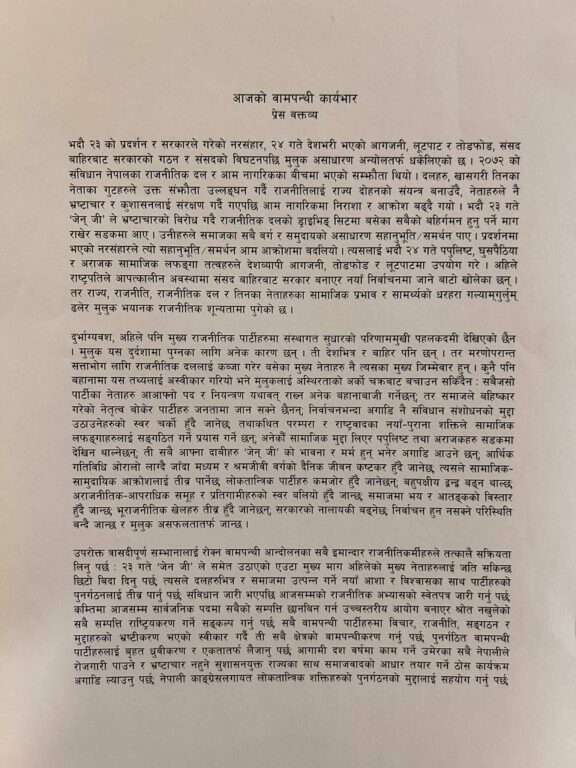 नेकपा एकीकृत समाजवादीका महासचिव घनश्याम भुसालले जेनजी पुस्ताले आन्दोलनको क्रममा राखेका माग अनुसार मुख्य नेताहरूलाई छिटो बिदा गर्नुपर्ने बताएका छन्।