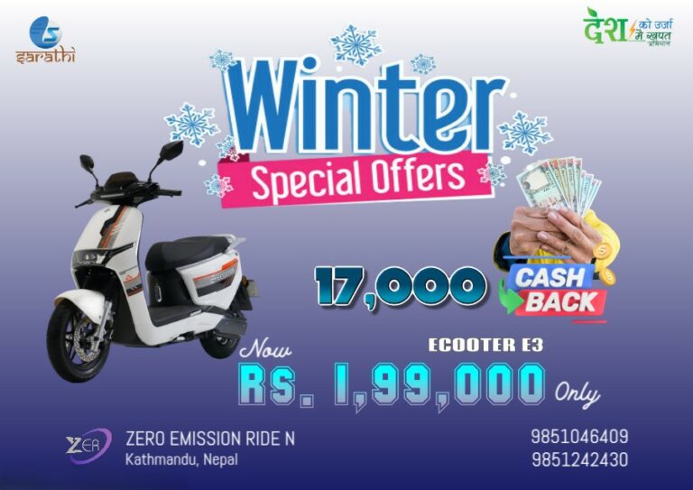 काठमाडौं । नेपाली बजारमा लोकप्रियता हासिल गर्दै आएको सारथी ब्राण्डको विद्युतीय स्कुटरले यो चिसो मौसमलाई अझ उत्साहपूर्ण बनाउन ‘विन्टर अफर’ सार्वजनिक गरेको छ । अब ग्राहकहरूले सारथीका विभिन्न मोडेलका स्कुटर खरिद गर्दा अधिकतम रु. १७ हजारसम्मको नगद छुट पाउन सक्नेछन् । कम्पनीका अनुसार यो अफर सीमित अवधिका लागि मात्र उपलब्ध हुनेछ ।