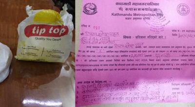 काठमाडौं । काठमाडौँ महानगरपालिकाले टिपटप मिठाई पसललाई रु दुई लाख जरिवाना गरेको छ । बजार अनुगमनका क्रममा काठमाडौँ महानगरपालिका वडा