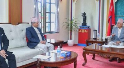 काठमाडौ । राष्ट्रपति रामचन्द्र पौडेलसँग नेपाल राष्ट्र बैंकका गभर्नर महाप्रसाद अधिकारीले भेट गर्नुभएको छ । राष्ट्रपति भवनमा शुक्रबार राष्ट्रपति र