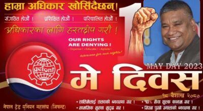 काठमाडौं । नेपाल ट्रेड युनियन महासंघ (जिफन्ट) ले ‘अधिकारका लागि हस्तक्षेप गरौं’ नारासहित १३४ औं अन्तर्राष्ट्रिय श्रमिक दिवस २०२३ भोलि