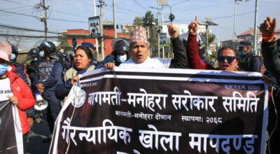 काठमाडौं-गैर न्यायिक सडक तथा खोलानदी, मापदण्ड पीडित संघर्ष समितिले काठमाडौंको माइतीघर मण्डलामा विरोध प्रर्दशन गरेको छ । बिहीबार खोला मिच्न