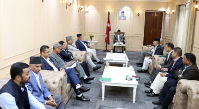 काठमाडौं । प्रधानमन्त्री पुष्पकमल दाहाल ‘प्रचण्ड’ले संसद्मा देखिएको अवरोध हटाउने विषयमा राष्ट्रिय मान्यता प्राप्त दलका शीर्ष नेतासँग छलफल गर्नुभएको छ