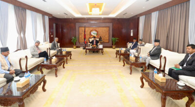 काठमाडौं । प्रधानमन्त्रीको सरकारी निवास बालुवाटारमा सभामुख देवराज घिमिरेसहित सत्ता र प्रमुख प्रतिपक्षी दलका नेताहरूबीच छलफल जारी छ। छलफलमा प्रधानमन्त्री