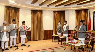 काठमाडौं । नेपाली काँग्रेसबाट नियुक्त भएका तीन जना मन्त्रीले शपथ लिएका छन्। बिहीबार अपरान्ह शितल निवासमा आयोजित समारोहमा राष्ट्रपति रामचन्द्र