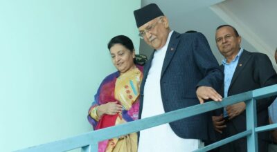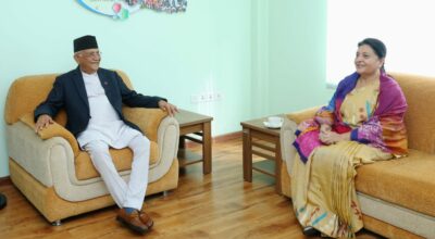काठमाडौं । नेकपा एमालेका अध्यक्ष केपी शर्मा ओली र पूर्वराष्ट्रपति विद्यादेवी भण्डारीबीचको भेटवार्ता सकिएको छ । उनीहरूबीच आज साढे ३