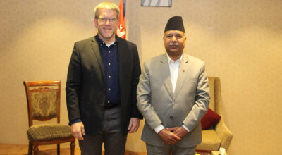 काठमाडौँ। उपराष्ट्रपति रामसहाय प्रसाद यादवसँग नेपालका लागि संयुक्त राज्य अमेरिकाका राजदूत डिन आर थम्प्सनले आज लैनचौरस्थित उपराष्ट्रपतिको कार्यालयमा शिष्टाचार भेटवार्ता
