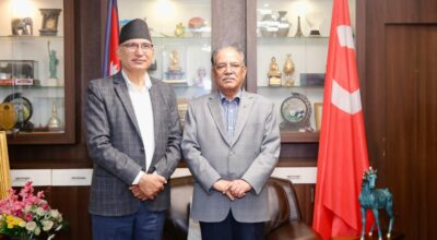 काठमाडौं, २३ वैशाख । उपप्रधानमन्त्री एवं अर्थमन्त्री विष्णु पौडेल र माओवादी केन्द्रका अध्यक्ष एवं पूर्वप्रधानमन्त्री पुष्पकमल दाहाल ‘प्रचण्ड’बीच भेटवार्ता भएको
