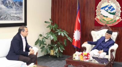काठमाडौं । प्रधानमन्त्री केपी शर्मा ओलीसँग भारतीय जनता पार्टी (भाजपा) का विदेश प्रमुख विजय चौथाइवालेले भेटवार्ता गरेका छन् । नेपाल