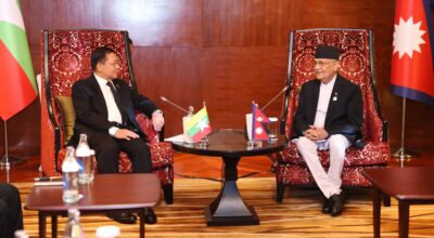 बैङ्कक : थाइल्याण्डको औपचारिक भ्रमणमा रहनुभएका प्रधानमन्त्री केपी शर्मा ओली र म्यान्मारका प्रधानमन्त्री मिन आङ हलिङबीच आज बैंककमा भेटवार्ता भएको