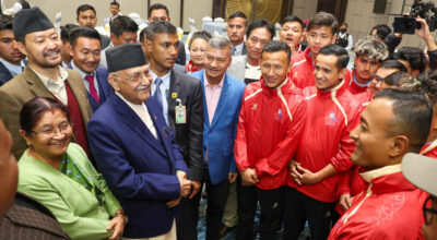काठमाडौँ : प्रधानमन्त्री केपी शर्मा ओली र तेस्रो केपी ओली कप फुटबल च्याम्पियनसिपका खेलाडी तथा आयोजकबीच आज भेटघाट भएको छ