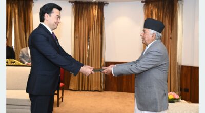 काठमाडौँ, २५ मङ्सिर । राष्ट्रपति रामचन्द्र पौडेलसमक्ष नेपालका लागि नवनियुक्त राजदूतहरूले आआफ्नो ओहोदाको प्रमाणपत्र पेस गरेका छन् । राष्ट्रपति भवनमा