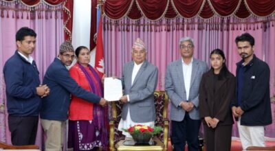 काठमाडौं–राष्ट्रपति रामचन्द्र पौडेलसमक्ष इजरायलमा बेपत्ता भएका कञ्चनपुर भीमदत्त नगरपालिकाका विपिन जोशीको परिवारले छिटो र सकुशल उद्धारका लागि आवश्यक पहल गरिदिन