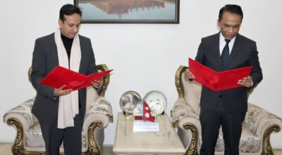 काठमाडौं । नबिल बैंक लिमिटेडका नवनियुक्त सञ्चालक समितिका अध्यक्ष निर्वाण कुमार चौधरीले नेपाल राष्ट्र बैंकका गर्भनर प्रा.डा. विश्वनाथ पौडेलबाट पद
