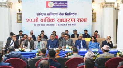 काठमाडौं । राष्ट्रिय वाणिज्य बैंक लिमिटेडको २० औं वार्षिक साधारणसभा २०८२ पुस २९ गते, मंगलबार काठमाडौंमा सम्पन्न भएको छ ।