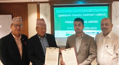 काठमाडौं । समृद्धि फाइनान्स कम्पनी लिमिटेड र पोखरा फाइनान्स लिमिटेडबीच आइतबार मर्जर सम्बन्धी समझदारी पत्रमा हस्ताक्षर भएको छ । दुवै कम्पनी