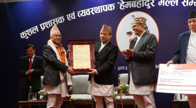काठमाडौँ- साल्टट्रेडिङ कर्पोरेसनका संस्थापक स्व हेमबहादुर मल्लको सम्मानमा स्थापना गरिएको ‘हेमबहादुर मल्ल सम्मान २०८०’ पूर्वप्रधानन्यायाधीश कल्याण श्रेष्ठलाई प्रदान गरिएको छ