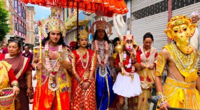 बागलुङ (गलकोट) २९ गते । राम, सीता, लक्ष्मण, कृष्ण, राधा र हुनमान लगायतको भेषमा सजिएको शोभायात्रा । बागलुङमा संरक्षित बास्सा नाच