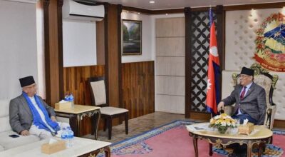 काठमाडौं-प्रधानमन्त्री एवम् माओवादी केन्द्रका अध्यक्ष पुष्पकमल दाहाल प्रचण्ड र नेकपा एमालेका अध्यक्ष केपी शर्मा ओलीबीच भेटवार्ता भएको छ। प्रधानमन्त्रीको सरकारी