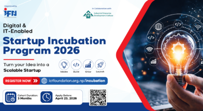 काठमाडौं । नेपाल सरकारअन्तर्गत औद्योगिक उद्यम विकास संस्थान (आईईडीआई)ले आईसीटी फाउन्डेसन नेपाल (आईएफएन)लाई बिजनेस इन्क्युबेसन सर्भिस (बीआईएस) अपरेसन एन्ड म्यानेजमेन्ट