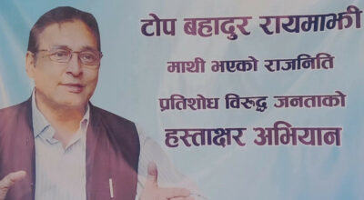 काठमाडौँ : नेकपा (एमाले)का निलम्बित सचिव टोपबहादुर रायमाझीको पक्षमा पनि हस्ताक्षर अभियान सञ्चालन गरिएको छ। नक्कली भुटानी शरणार्थी प्रकरणमा मुछिएर