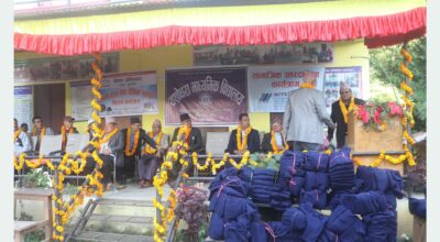 भोजपुर : भोजपुर नगरपालिका–१२ टक्सारस्थित यशोधरा माध्यमिक विद्यालयका पाँच सय विद्यार्थीलाई न्यानो कपडा र शैक्षिक सामग्री वितरण गरिएको छ ।
