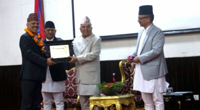 काठमाडौँ- राष्ट्रपति रामचन्द्र पौडेलले वरिष्ठ पत्रकार एवं सूचनाको हकका अभियन्ता तारानाथ दाहाललाई सम्मान गर्नुभएको छ । सूचनाको हकको कार्यान्वयन, प्रवर्द्धन र