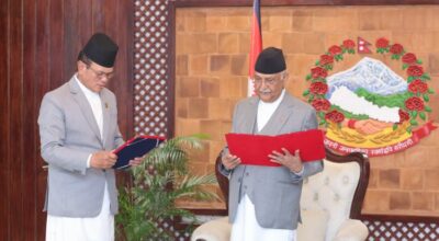 काठमाडौं, २१ बैशाख । प्रधानमन्त्री केपी शर्मा ओली समक्ष नवनियुक्त ऊर्जा, जलस्रोत तथा सिँचाइ राज्यमन्त्री खमबहादुर गर्बुजाले आज पद तथा