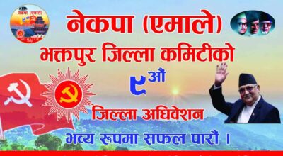 भक्तपुर । नेकपा एमाले भक्तपुरलाई यतिबेला अधिवेशनको चटारो लागेको छ । जेठ ३ गते सुरु नवौं जिल्ला अधिवेशनकोलागि प्रतिनिधि चयन