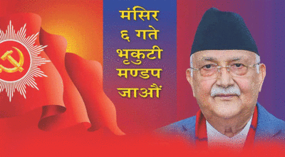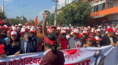 काठमाडौँ, ६ मङ्सिर । नेपाल कम्युनिष्ट पार्टी (एमाले)ले आज राजधानीमा प्रदर्शन र र्याली आयोजना गरेको छ । काठमाडौँकेन्द्रित जनसभाका लागि